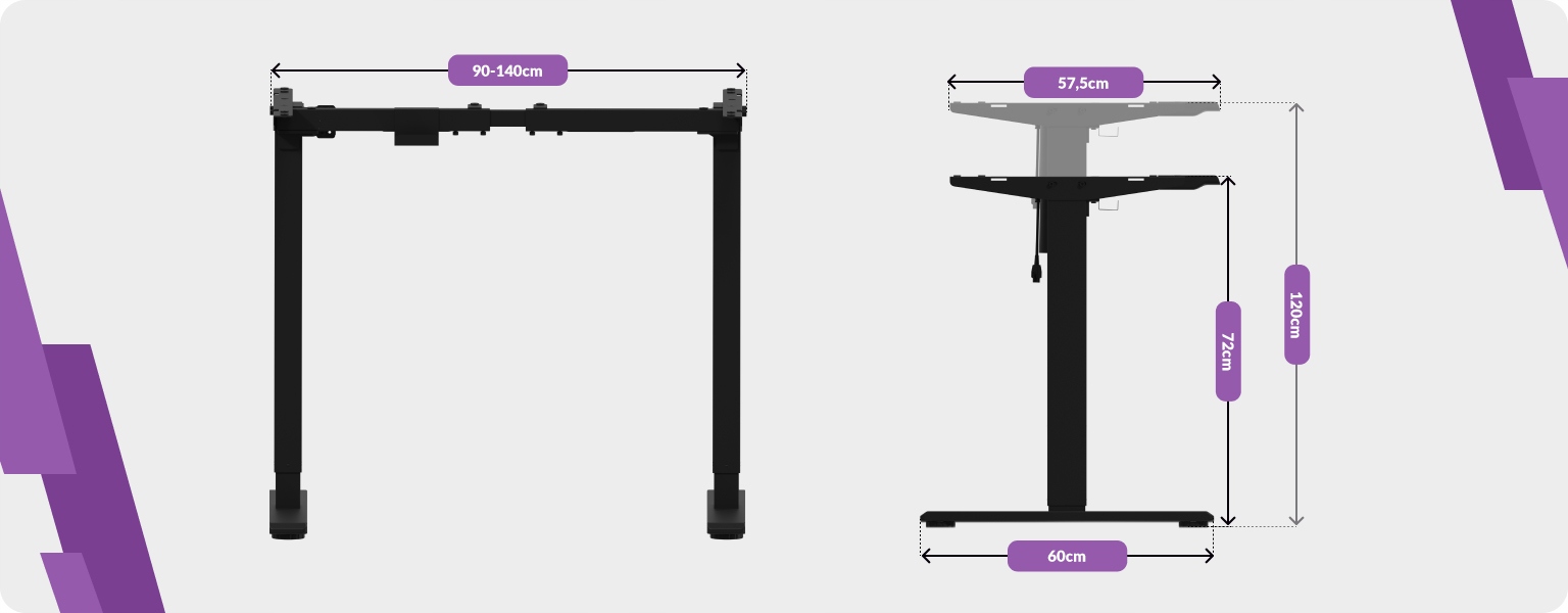 Конструкция каркаса электрического стола SPE-142O имеет регулируемую ширину, которую можно изменять от 90 до 140 см. Благодаря этим параметрам мы предлагаем использовать столешницу шириной от 100 до 160 см. Дополнительно стол можно регулировать по вертикали, диапазон его регулировки составляет от 72 до 120 см.