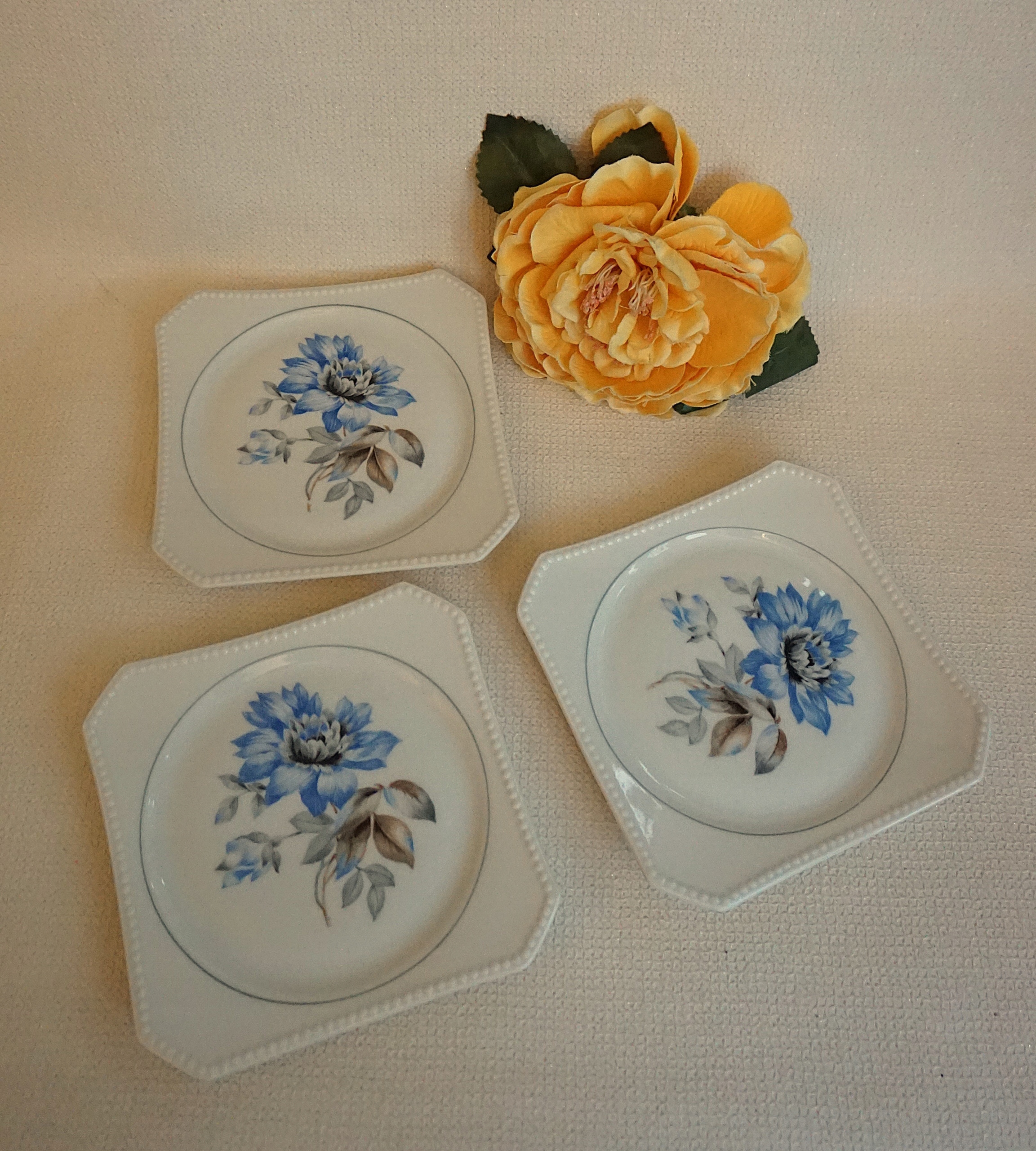 Цвет фарфора: белый. В зеркале каждой тарелки изображен большой стилизованный цветок синего цвета.