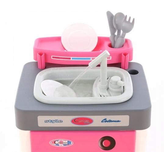 Маленькие девочки любят подражать своим матерям в их обязанностях домохозяек. После успешной вечеринки друзей кукол и мягких игрушек клиники пришло время большой стирки. Настоящее мытье посуды. Это станет возможным благодаря специальной детской посудомоечной машине «Кармен», которая предельно реалистично имитирует работу реального устройства. Детская посудомоечная машина Carmen от Wader – необыкновенная игрушка. Оборудована моечной камерой с корзиной для посуды, мойкой с краном и сушилкой. Имеет пять рабочих функций, которые активируются с помощью отдельных кнопок (предварительная стирка, основная стирка, сушка, полный цикл, регулятор температуры). Преимуществом игры с детской посудомоечной машиной «Кармен» является возможность использования воды в процессе механической и ручной мойки. Заполнив пространство в дверце водой, мы получаем эффект мокрого стекла, а значит и впечатление, будто посуду действительно моют. Кроме того, подсветка салона позволяет наблюдать за всем циклом. Вода течёт из крана! Если наполнить им раковину и открыть кран, наша маленькая хозяйка сможет вымыть посуду под проточной водой. Замкнутая цепь, в свою очередь, означает, что веселью не будет конца.