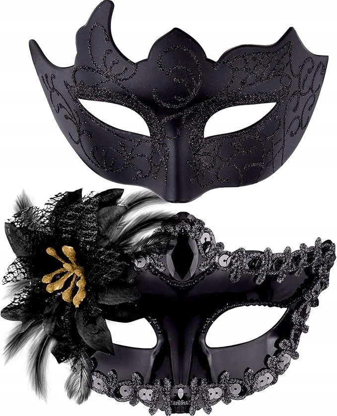 В набор входят две маски - классическая черная маска для мужчины и маска для женщины, украшенная кристаллами и цветочным мотивом. Идеальное сочетание стиля и элегантности.