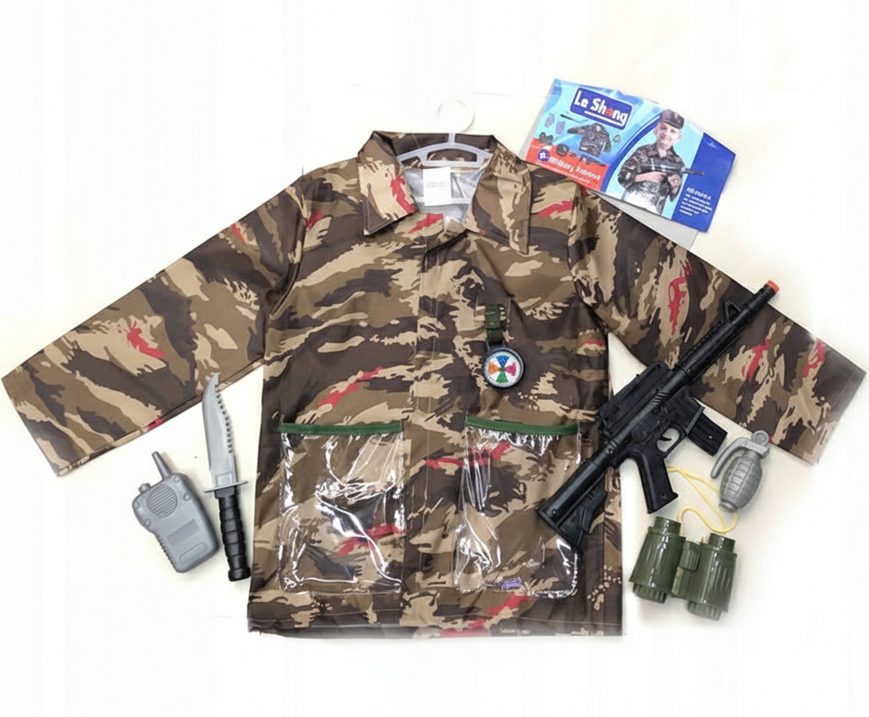 - ✅ Полный комплект 8 в 1: В коробке вы найдете все, что нужно маленькому рекруту: униформу, шапку, винтовку, гранату, нож, бинокль, компас и рацию.