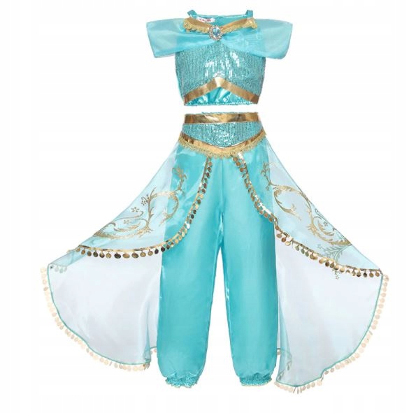 Красивый костюм/маскировка принцессы Жасмины в бирюзы. Верхняя часть наряда слегка растянута, на толстых ремнях, передние сияния. Элегантная отделка вырез - это платка из тюля, окружающая руки и бирюзовый брошь. Блузка относительно короткая, благодаря которой животик будет немного на вершине. Штаны, растягивающиеся на талии. С брюками, шифоновыми элементами, которые приобретают очарование во время танца во время движения. Ноги внизу имеют шишку, благодаря тому, что они будут хорошо придерживаться ног. p>