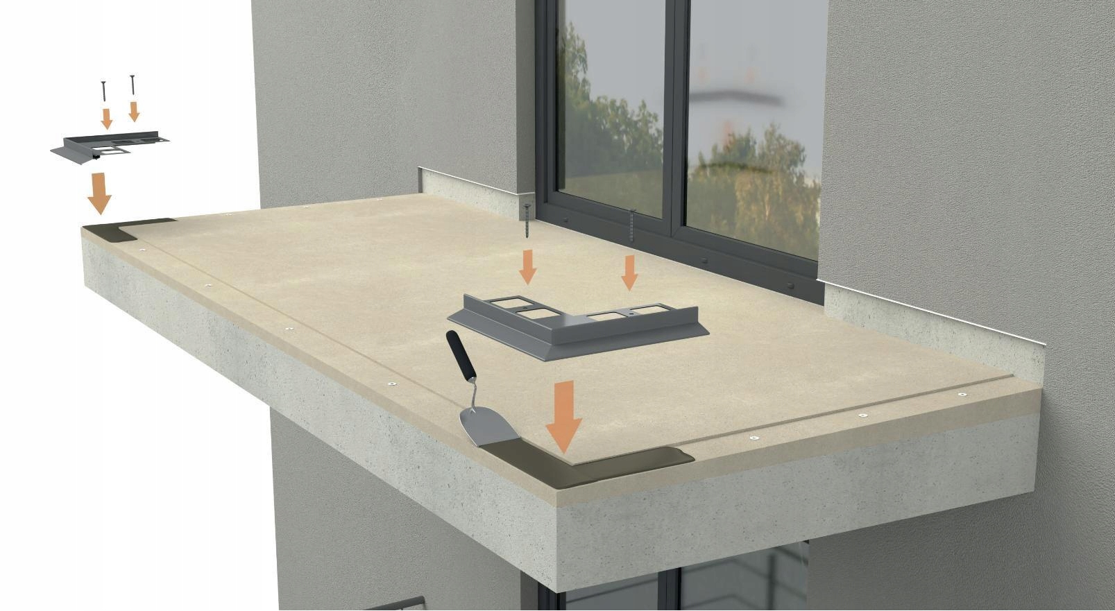 Соединение профилей с цементным основанием с помощью уплотнительной ленты Renoplast CLEVER, наклеенной на герметизирующий раствор.