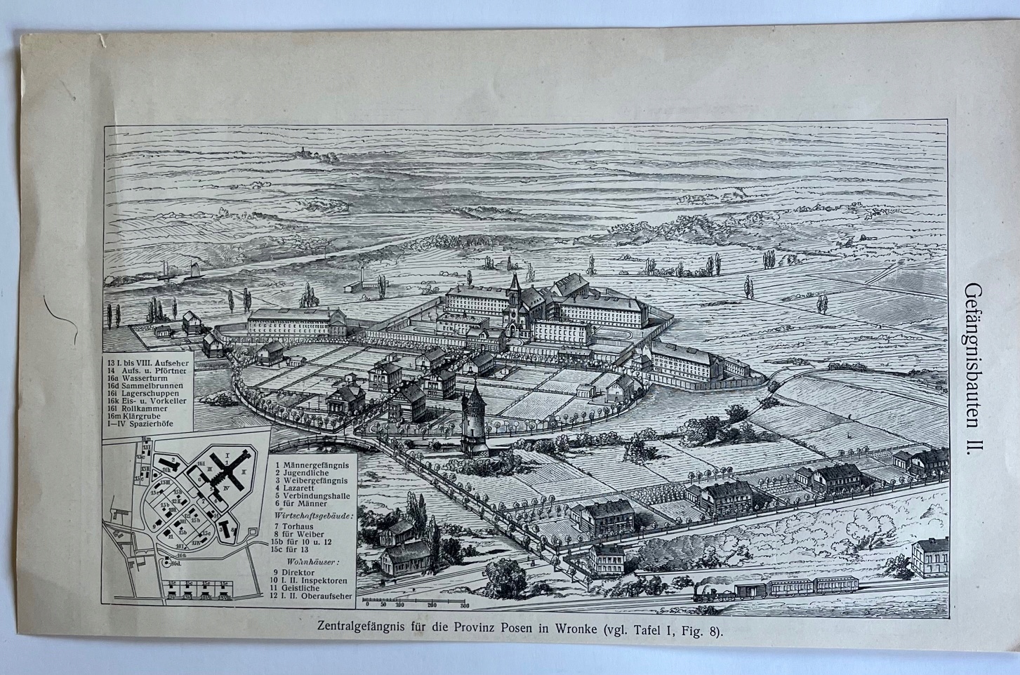 Описание предмета: Оригинальная карта, план тюрьмы во Вронках, на обороте подробный план зданий и схемы устройства камер. карта взята из 6-го издания словаря Мейерса.