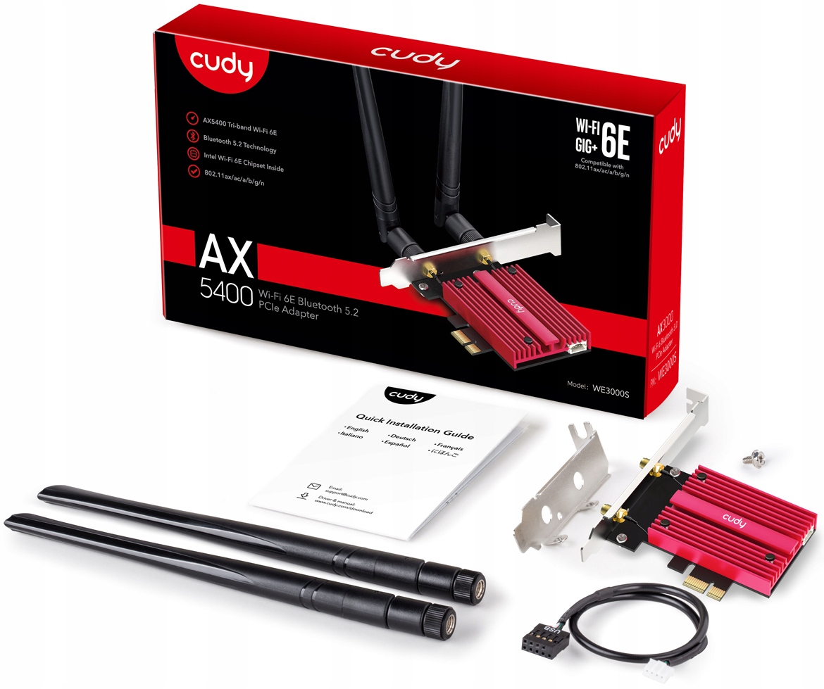 Cudy WE3000S — это современная беспроводная карта PCI-E, поддерживающая три диапазона (2,4 ГГц, 5 ГГц, 6 ГГц), поиск по которым возможен одновременно. Используя канал 6 ГГц, вы можете добиться превосходной производительности при одновременном снижении помех. Технология беспроводной передачи Wi-Fi 6E имеет большое преимущество перед нынешней технологией Wi-Fi 4 (802.11n) — она даже в 10 раз быстрее. Самая высокая скорость беспроводной связи может составлять от 2,4 ГГц до 300 Мбит/с (802.11n) до 574 Мбит/с (802.11ax), а также от 5 ГГц и 6 ГГц до 2400 Мбит/с (802.11ax). Благодаря этой карте вы сможете наслаждаться высокой скоростью при работе в Интернете.