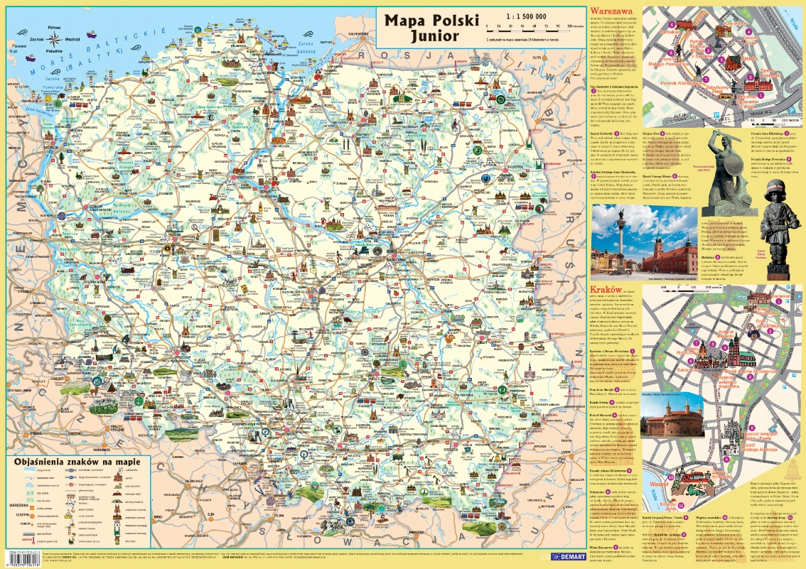 На карте Polish Junior, предназначенной для детей младшего школьного возраста, показаны наиболее важные туристические достопримечательности и текущая национальная сеть дорог. Он содержит сотни специально выполненных рисунков, которые призваны познакомить юных читателей с картой и побудить их к поиску информации о сокровищах польской культуры и природы. Две прогулки по Варшаве и Кракову стимулируют туристические поездки по городу. Язык описаний адаптирован к возможностям юных читателей, как и специальные планы исторических центров городов.