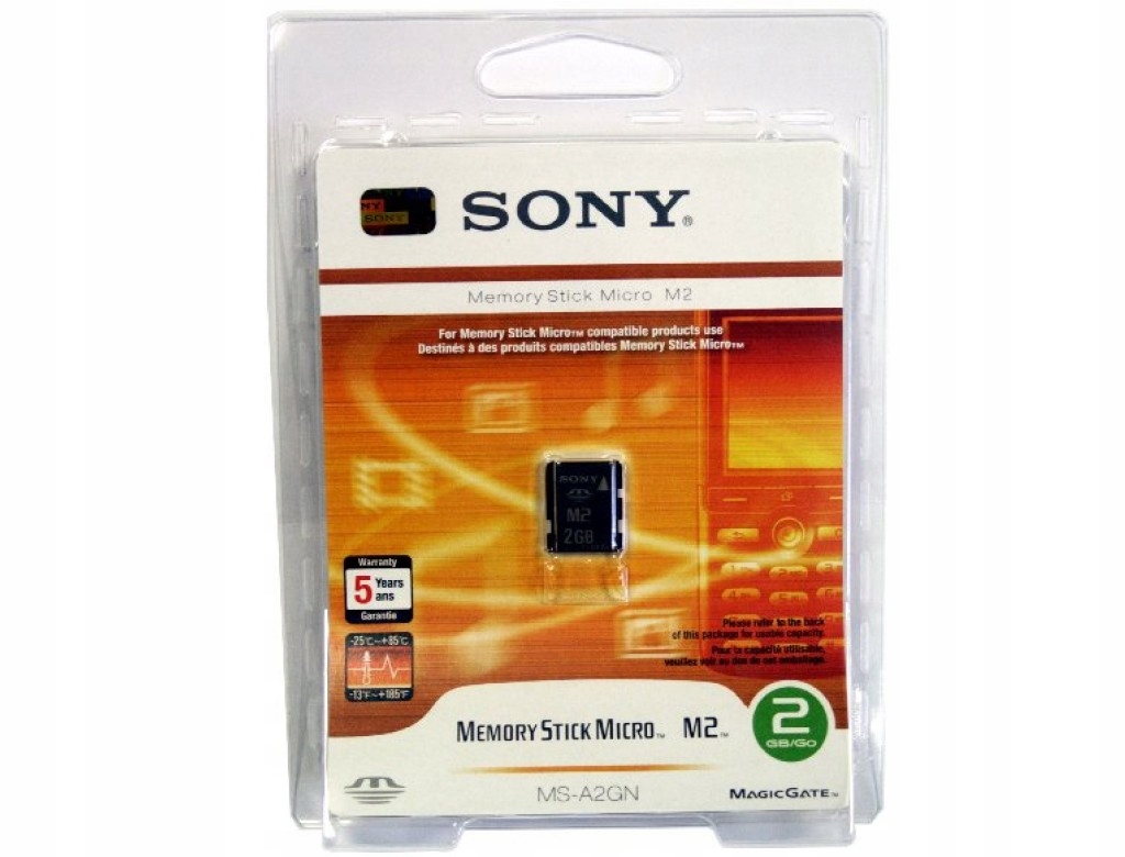 Карта памяти Sony Micro M2 — 2 ГБ. Карта памяти Sony Memory Stick Micro™ (M2™) создана для удовлетворения растущих потребностей ультракомпактных многофункциональных мобильных телефонов в хранении данных. Размер M2™ составляет примерно четверть размера карты Memory Stick PRO Duo™, а толщина составляет всего около 1,2 мм. Поскольку он питается от двойного напряжения, его можно использовать как с мобильными телефонами (1,8 В), так и с продуктами, совместимыми с Memory Stick PRO™, работающими с напряжением 3,3 В.
