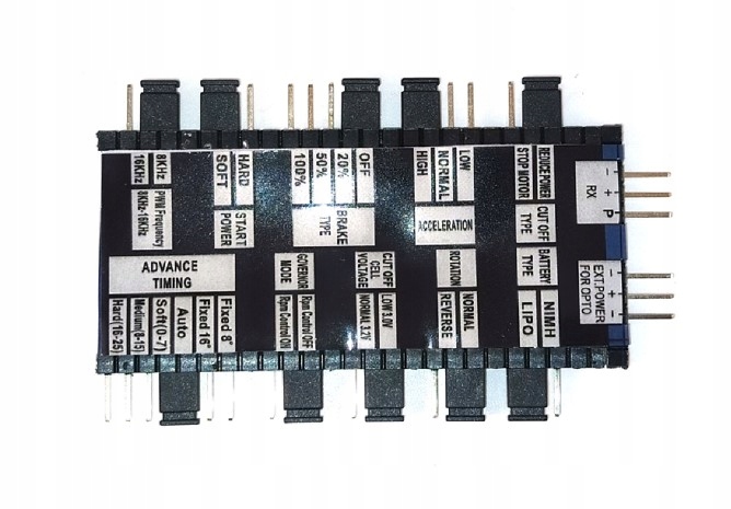 Карта программирования Redox, предназначенная для регуляторов Redox серии EVO. Благодаря понятному описанию программируемых функций и легкосъемным перемычкам позволяет быстро запрограммировать заданную функцию в контроллере, без необходимости входа в режим программирования (где параметры устанавливаются по звуковой клавише с помощью ручки газа) . Кроме того, карта позволяет более точно настроить параметры, например, регулировку ускорения или выбор точного угла опережения.