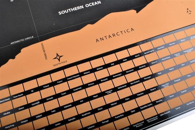 - Высокое качество исполнения - изделие выполнено в классическом стиле, цвет черный с золотом. Каждая страна и континент были покрыты стираемой алюминиевой фольгой. Фольга имеет однородный цвет, но при стирании появляются разные оттенки и четкие контуры отдельных стран. Бумага, из которой изготовлена скретч-карта, имеет соответствующую структуру и высокое качество, поэтому при царапании бумага не рискует повредиться и выглядеть некрасиво.