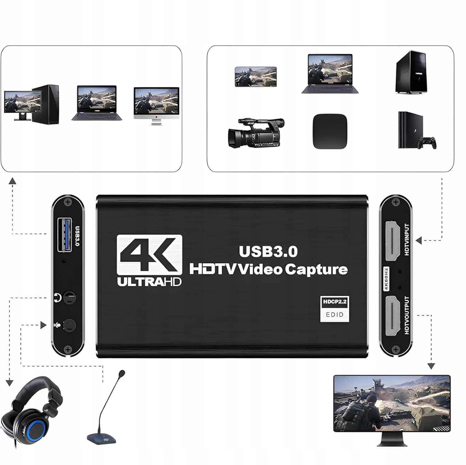 ВИДЕРЕКОРДЕР HDMI, КАРТА ЗАХВАТА HDMI 4K USB 3.0, ЧЕРНАЯ