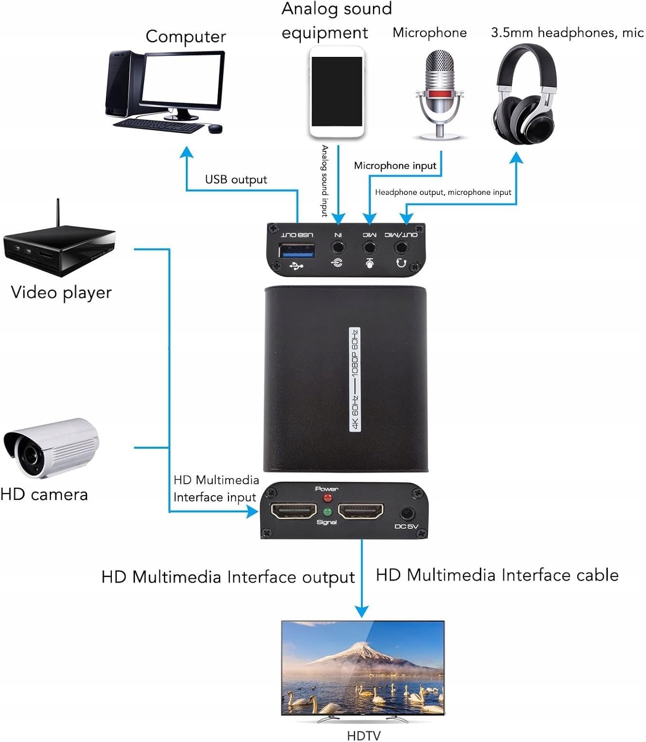 Вход 4K Карта видеозахвата оснащена интеллектуальным чипом, который поддерживает ввод мультимедийного интерфейса HD до 4K со скоростью 60 кадров в секунду, поэтому устройство может сразу работать с потоковым мультимедиа, таким как OBS. Идеально подходит для прямых трансляций, видеозаписи конференц-залов и многого другого. С помощью 35-мм порта вы можете подключить устройство захвата аудио и видео к гарнитуре с 35-мм аудиовыходом, а также к 35-мм микрофону для передачи и простой записи вашего голоса через порт. Многофункциональный, оснащенный выходным портом мультимедийного интерфейса HD для игр в реальном времени. Его также можно использовать с зеркальными камерами для записи видео, захвата видео и аудио, передачи сигналов на компьютер для просмотра или хранения, а также для совместного использования выходного видео HD Multimedia Interface на экране. Широко совместимая карта видео- и аудиозахвата работает с ОС Windows 7, 8, 10. USB3.0 В этой карте видеозахвата используется настоящий набор микросхем протокола USB3.0. Это настоящая карта захвата с мультимедийным интерфейсом USB3.0 HD, которая поддерживает захват с разрешением YUV422 1080P и частотой 60 кадров в секунду, идеально подходящий для живых игр и записи.