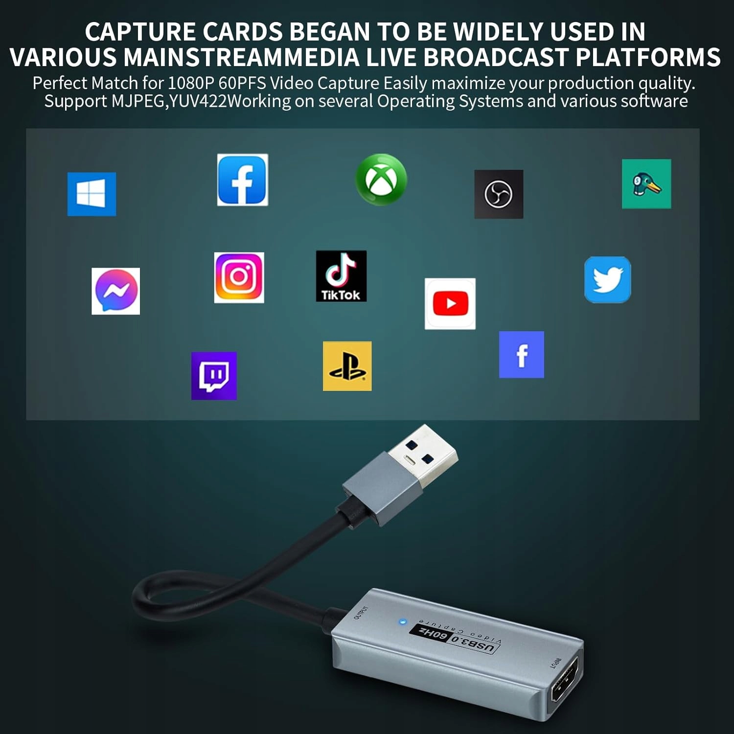 【Содержимое упаковки и меры предосторожности】 1 карта видеозахвата HD 3.0, 1 адаптер USB 3.0 на USB C, 1 руководство пользователя на английском языке. Обратите внимание, что после завершения настроек звука необходимо перезапустить программное обеспечение OBS Studio, иначе звук не будет воспроизводиться. 【Широкая совместимость с USB-картой захвата】Легкая трансляция на Facebook, Youtube или Twitch. Благодаря подключению это устройство видеозахвата HDMI-USB C/3.0 может работать на нескольких операционных системах и различном программном обеспечении: Windows 7/8/10, Mac OS или выше, Linux, Android, ноутбук, Xbox One, PS3/PS4/ PS5, камера, веб-камера, DSLR, Nintendo Switch, Steam, TV BOX, HDTV, Potplayer/VLC, ZOOM, OBS Studio и т. д. 【Подключи и работай, легко подключить Портативность】: Эта портативная карта видеозахвата маленькая и тонкая, поэтому ее можно легко взять с собой куда угодно. Нет необходимости устанавливать драйверы, внешний источник питания, просто подключите и работайте, вы можете просто подключить зеркальную камеру, видеокамеру или спортивную камеру к ПК или Mac для бесперебойной работы. 【Высокая стабильность, сверхнизкая задержка】Карта захвата HDMI изготовлена из высококачественного алюминиевого сплава и хорошо рассеивает тепло, обеспечивая лучшее качество изображения и предотвращая появление синих экранов и замятий бумаги. Эта карта захвата HDMI-USBC позволяет легко записывать и передавать высококачественное HD-аудио или видео на компьютер или потоковую платформу, позволяя записывать HD-видео со скоростью 60 кадров в секунду непосредственно на жесткий диск и смотреть его в прямом эфире. 【Запись видео True USB3.0 1080P, 60 Гц】: карта видеозахвата Fulfalic для входного сигнала HD 4K с частотой 60 Гц, максимальное выходное разрешение 1920×1080 с частотой 60 Гц. Поддерживает MJPEG, YUV422, обеспечивает высококачественную запись 1080P 60 кадров в секунду и прямую трансляцию. Карта видеозахвата нового поколения 3.0 идеально подходит для прямых трансляций и потоковой передачи игр в высоком разрешении 1080p со скоростью 60 кадров в секунду на OBS и других платформах.