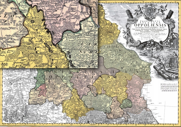 Таблица. 19 - (1752) 1736 Иоганн Вольфганг Виланд - Principatus Silesiae Oppoliensis strictissima tabula geographica, sistens circulos oppoliensem Ober Glogau, Gros Strehliz, Cosel, Tost, Rosenberg, Falcenberg, Lubleniz a J.W. Виланд, locumtenente caesareo, точно очерченный, et sumptibus Principum ar Ord. Силезия А.О.Р. MDCCXXXVI reducta et excusa Norimbergae ab Homannianis Haeredibus. [Прибл. 1:213 000]