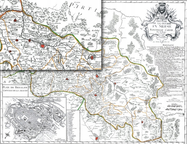 Таблица. 9 – 1741 — Театр военных действий в Новой Силезии, Par le Rouge Ingenieur Geographe du Roy et de son. КАК. Монстр Фе граф де Клермон. Avec Privilege du Roy 1741. [ок. 1:640 000]