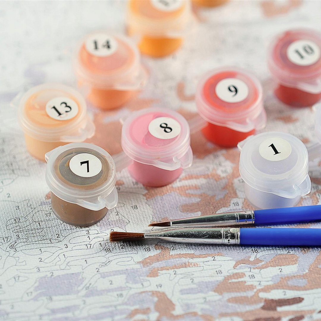 Краски хорошего качествав плотно закрытых упаковках, подходят для раскрашивания рисунка и не требуют смешивания цветов. Краски отличаются насыщенным цветом и изготовлены из безопасных ингредиентов. Чтобы исправить неправильно окрашенные участки, просто после высыхания покрасьте их краской соответствующего цвета. Чтобы черные линии схемы не проступали сквозь более светлые цвета, перед рисованием их можно также размыть белым карандашом, входящим в набор. Количества краски точно хватит, чтобы раскрасить картинку по номерам своими руками.