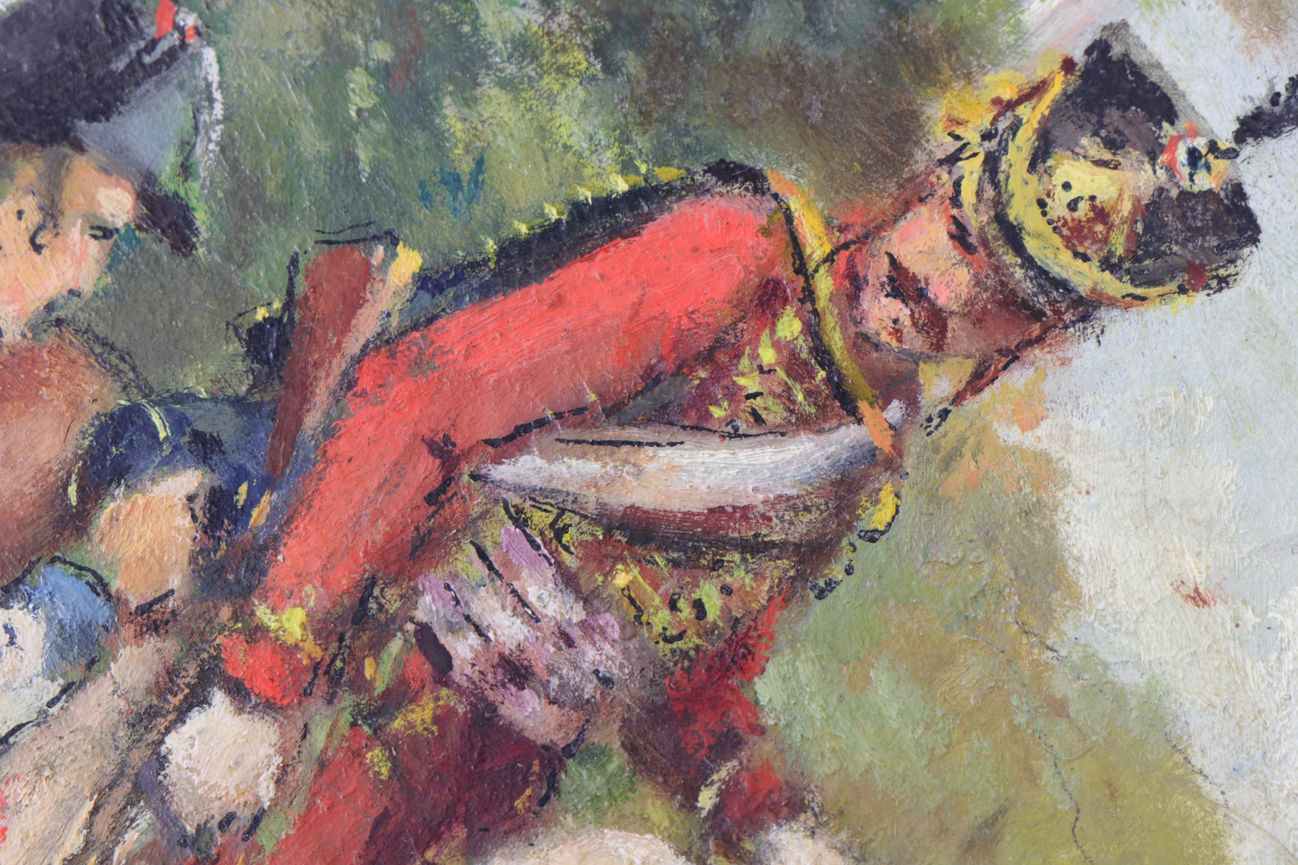 Картина маслом на картоне, изображающая наполеоновских солдат периода Первой Империи. Картина подписана трудночитаемым названием. На оборотной стороне описание картины и номер, в нижней части клеймо магазина живописных товаров компании Lefranc et Cie, которая снабжала многих известных живописцев, в том числе Жоржа Брака, Пикассо и Яцека Мальчевского.