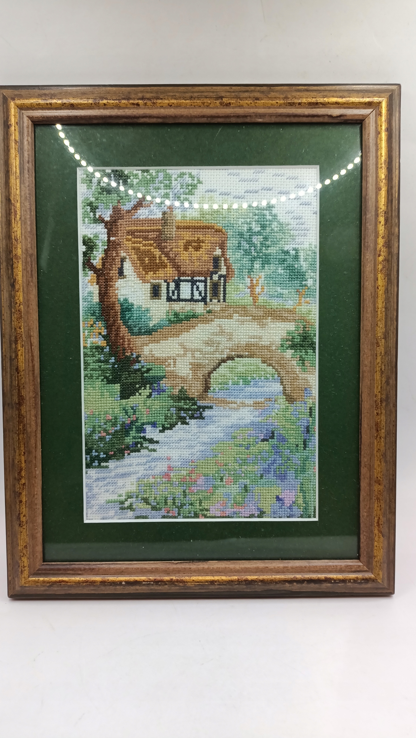 Картина в рамке за стеклом, вышивка крестиком "Домик на реке",