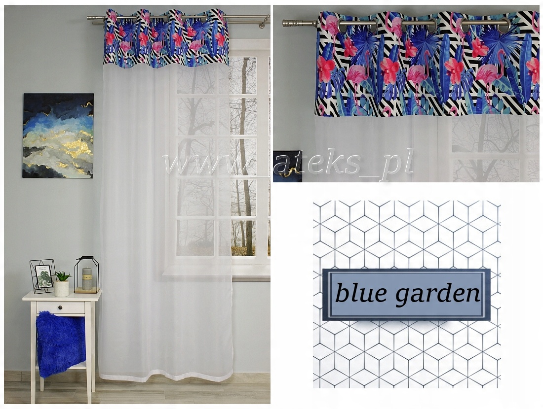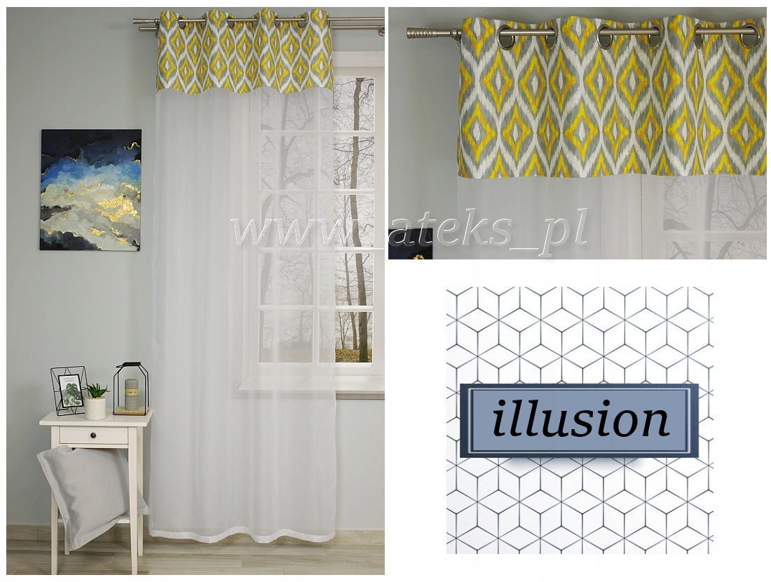 Штора - готовая вуаль + плотная ткань с люверсами. Ширина материала в верхней части примерно 35-40 см. Штора изготовлена из серебристых металлических люверсов. Декоративная штора имеет вшитую вверху ленту жесткости со вставленными в нее люверсами. Плотный, матовый материал, очень хорошее качество, красивые цвета.