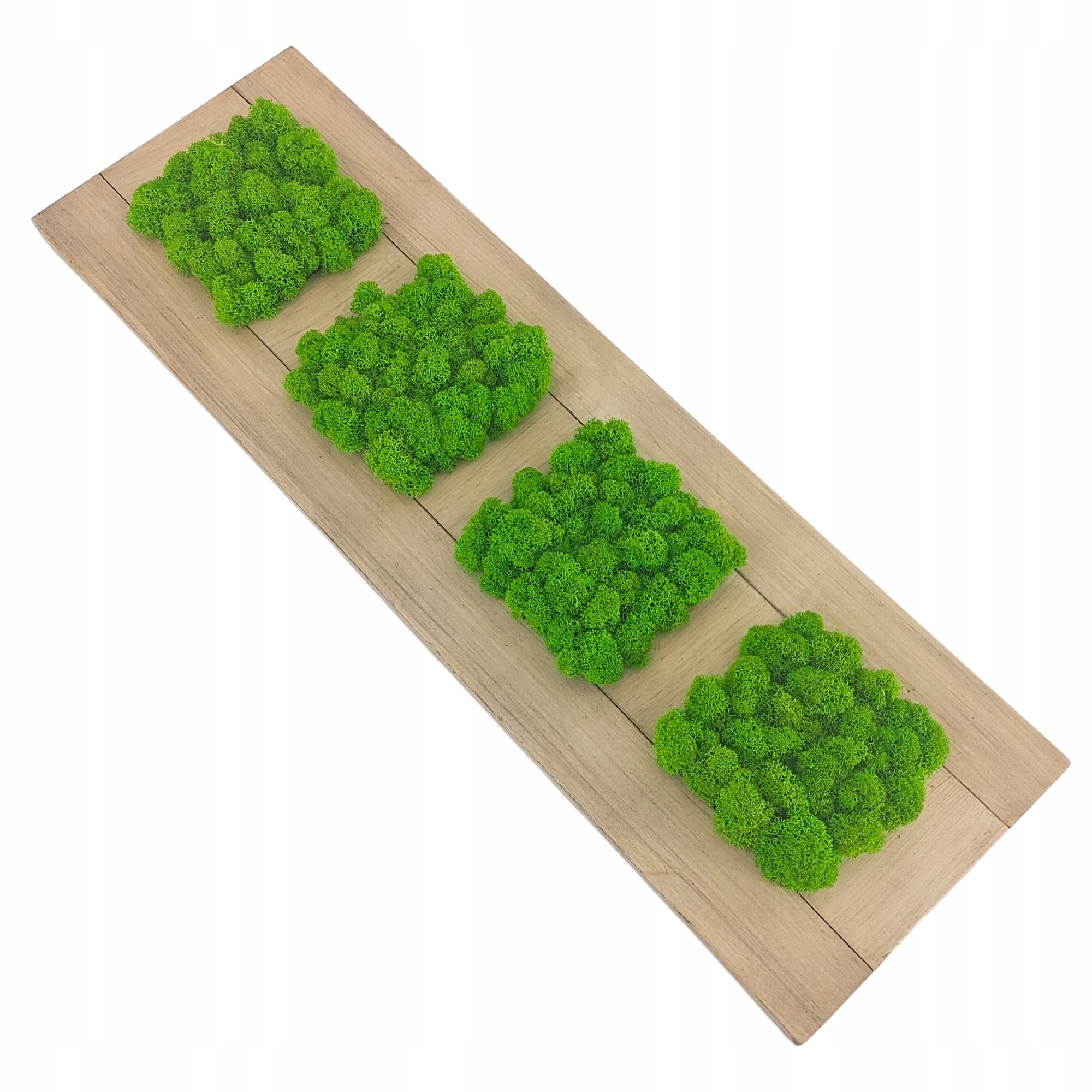 Картина из светлой вагонки помещена в привлекательную доску из клееного дерева размерами 61,5х19х2 сантиметра. Энергичный, салатовый цвет хроботки эффектно контрастирует с цветом рамы, создавая неочевидную композицию, от которой сложно оторвать взгляд. Тщательно отобранные пучки хроботки навсегда помещены в рамку. Они плотно прилегают друг к другу, создавая мягкую на ощупь, эластичную поверхность. Отдельные головки лишайника имеют разную высоту и немного разную окраску, что придает композиции эстетическую ценность.