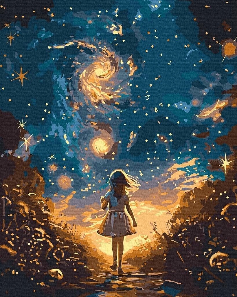 Погрузитесь в волшебную историю о девушке, которая идет к бесконечной вселенной, полной звезд и галактик. Этот образ, наполненный светом и загадкой, идеально подходит для вечерней расслабляющей живописи.