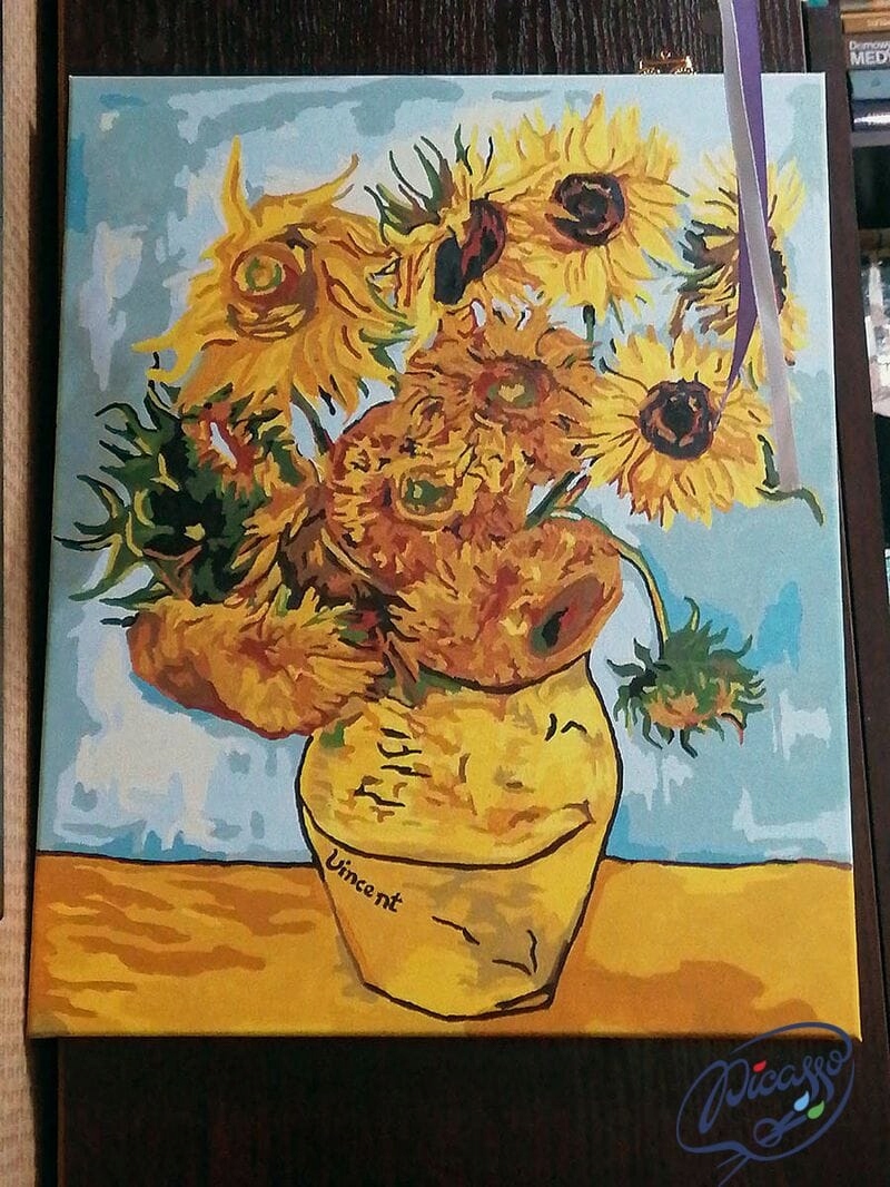 Краски не требуют смешивания, они также разлиты в отдельные баночки, каждая из которых имеет номер, присвоенный номеру на картине.