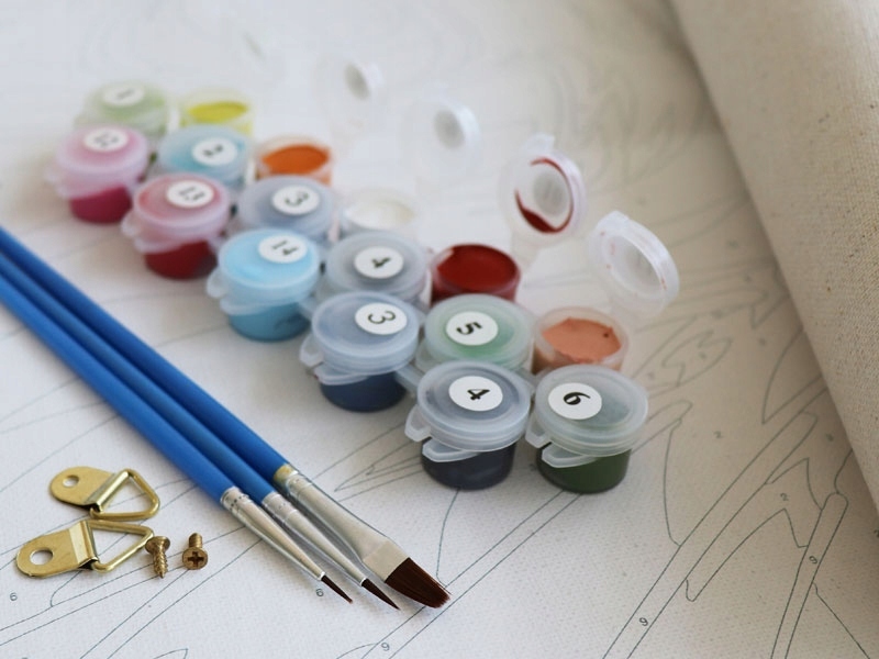 В комплект входит холст на деревянной раме, краски, кисти и держатели для подвешивания картины.
