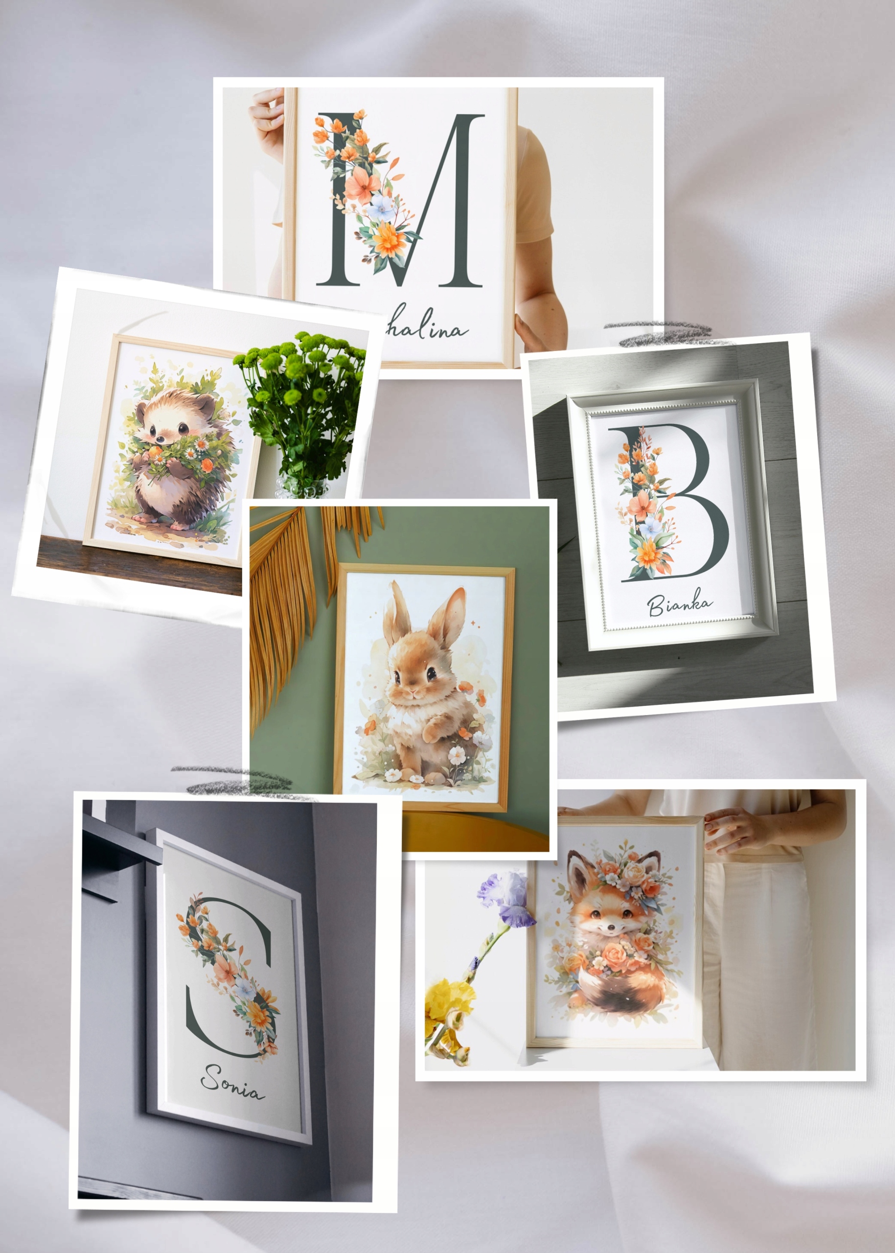 КАРТИНИ ДЛЯ ДИТЯЧОЇ КІМНАТИ ПЛАКАТИ А3 ТВАРИНИ КВІТИ ІМ'Я ДИТИНИ 3Х