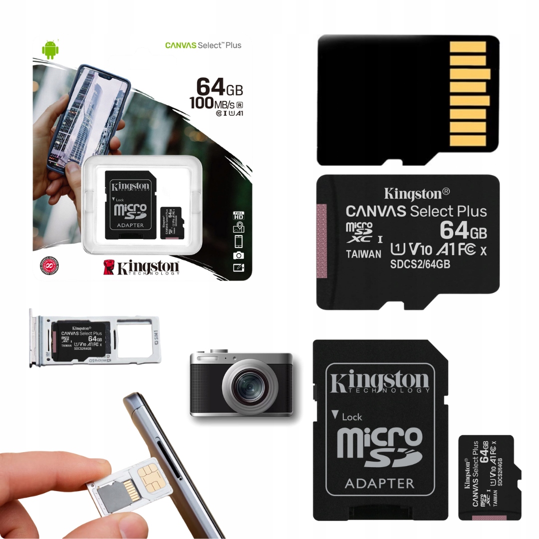 Kingston Canvas Select Plus (SDCS2/64GB) Это карта microSDXC с емкостью u1, v10, v10, v10, v10, v10, v10 u1, v10 u1. фильмов в Full HD. Сертификация a1 делает его также отличным для поддержки приложений на смартфонах Android. Карта устойчива к воде, ударам, радиации и температуре, а набор включает в себя адаптер SD, который повышает совместимость.