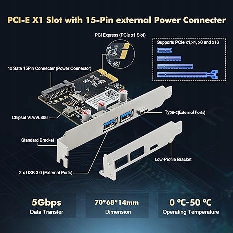 3 портов Эта USB -карта имеет 2 порта USB типа A и 1 порт USB типа C, поддерживает передачу данных USB от 3,0 до 5 Гбит/с, она ретроградно совместима с USB2.0 и USB1.1. Он связан с широким диапазоном USB -устройств, такими как клавиатуры USB, USB -мыши, динамики USB, коммутаторы KVM, концентраторы USB и многие другие устройства с интерфейсом USB -A и USB -C. Руководство также содержит низкопрофильную ручку, поддерживает многие установки, такие как компьютер, сервер, рабочая станция, US и т. Д. необходимость установить любые кабели питания. Он также поддерживает 15-контактный разъем SATA, если модель материнской платы старше и не может обеспечить достаточную мощность, его можно питать из источника питания.