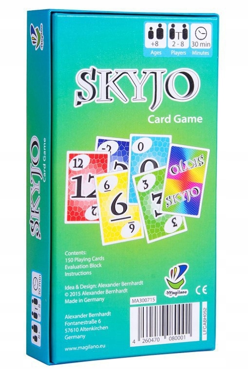 Skyjo — это карточная игра с набором наборов для двух-восьми игроков, в которой ваша цель — набрать как можно меньше очков за раунд. Рекомендуемый возраст — восемь лет и старше.