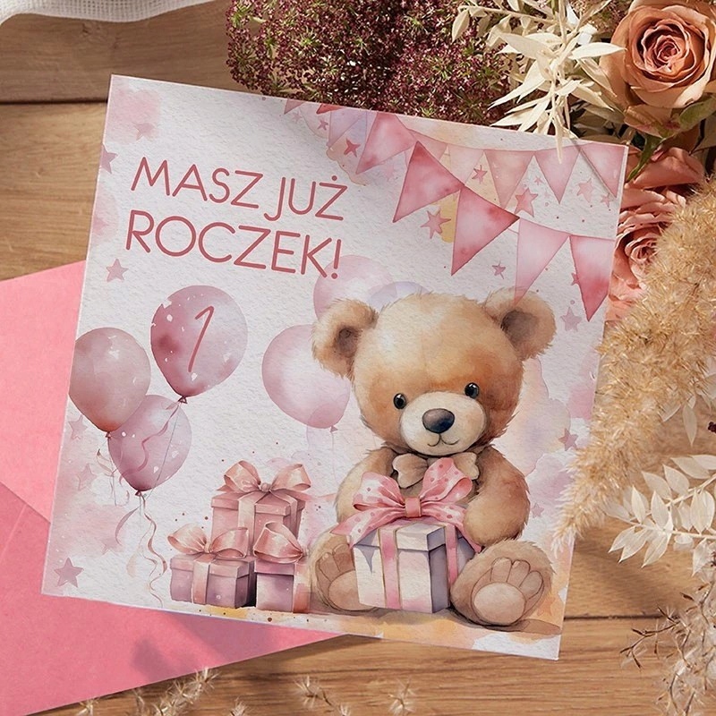 KARTKA życzenia na Roczek dla dziewczynki Miś (+koperta)