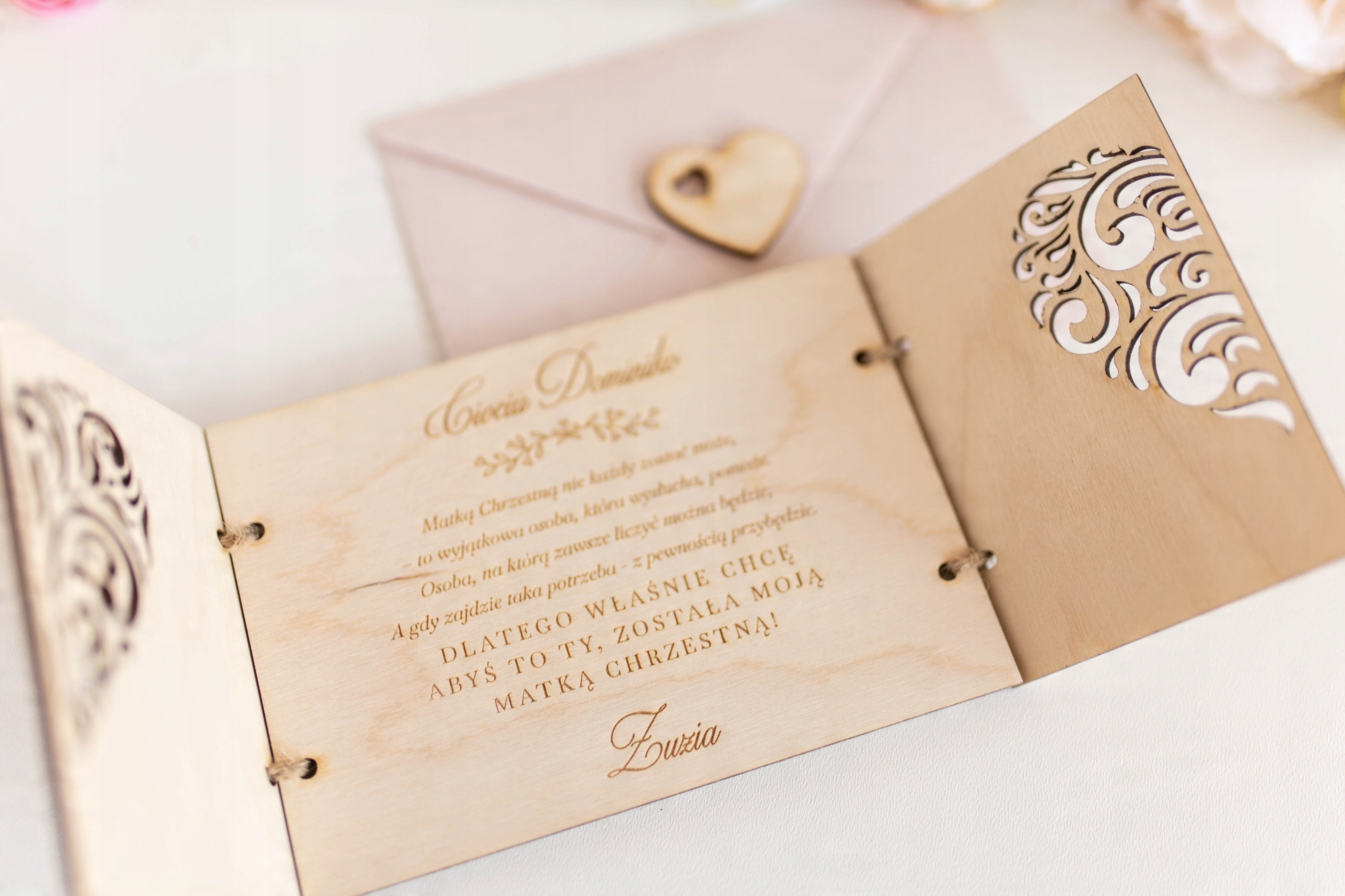 Деревянная книга с красивым вырезанным ажурным узором была перевязана декоративной джутовой веревкой. На обложке большое сердце или крылышки с надписью "Дорогая тетушка, дорогой дядя". Внутри стихотворение и вопрос к крестным :)