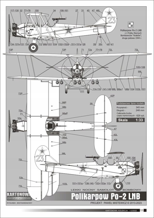 Картонная модель лёгкого ночного бомбардировщика Поликарпова По-2 ЛНБ. Машина в опознавательных знаках 2-го польского ночного бомбардировочного полка «Краков» второй половины 1944 года. Графически улучшенная модель, помимо прочего, имеет разделенные поверхности управления и бомбовое вооружение.