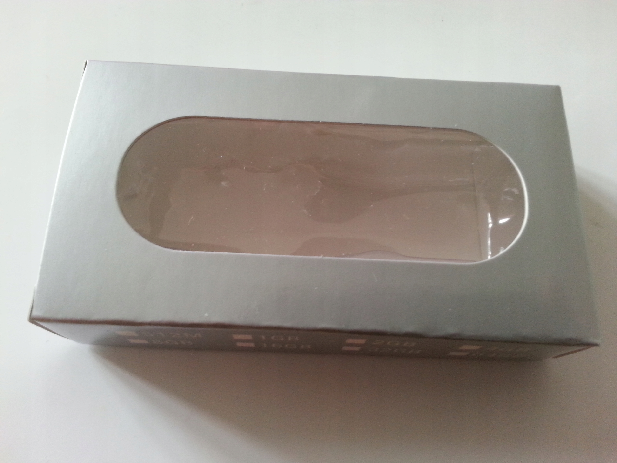 Коробки в простом классическом стиле. Относительно маленький. Прозрачная пластиковая вставка внутри коробки удерживает флешку в одном месте.