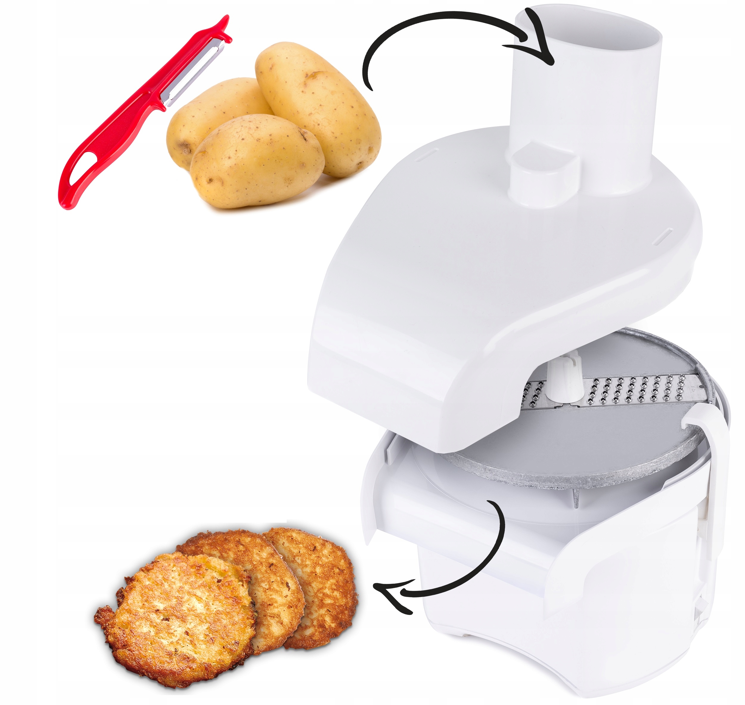 благодаря этому через несколько мгновений вы можете приготовить кишечник, картофельные блины, пельмени, картофельный торт и многие другие вкусные блюда. Больше нет с рваными пальцами и часом -на руке Grater !!! Используя его один раз заставит вас больше не хотеть расставаться с ним!