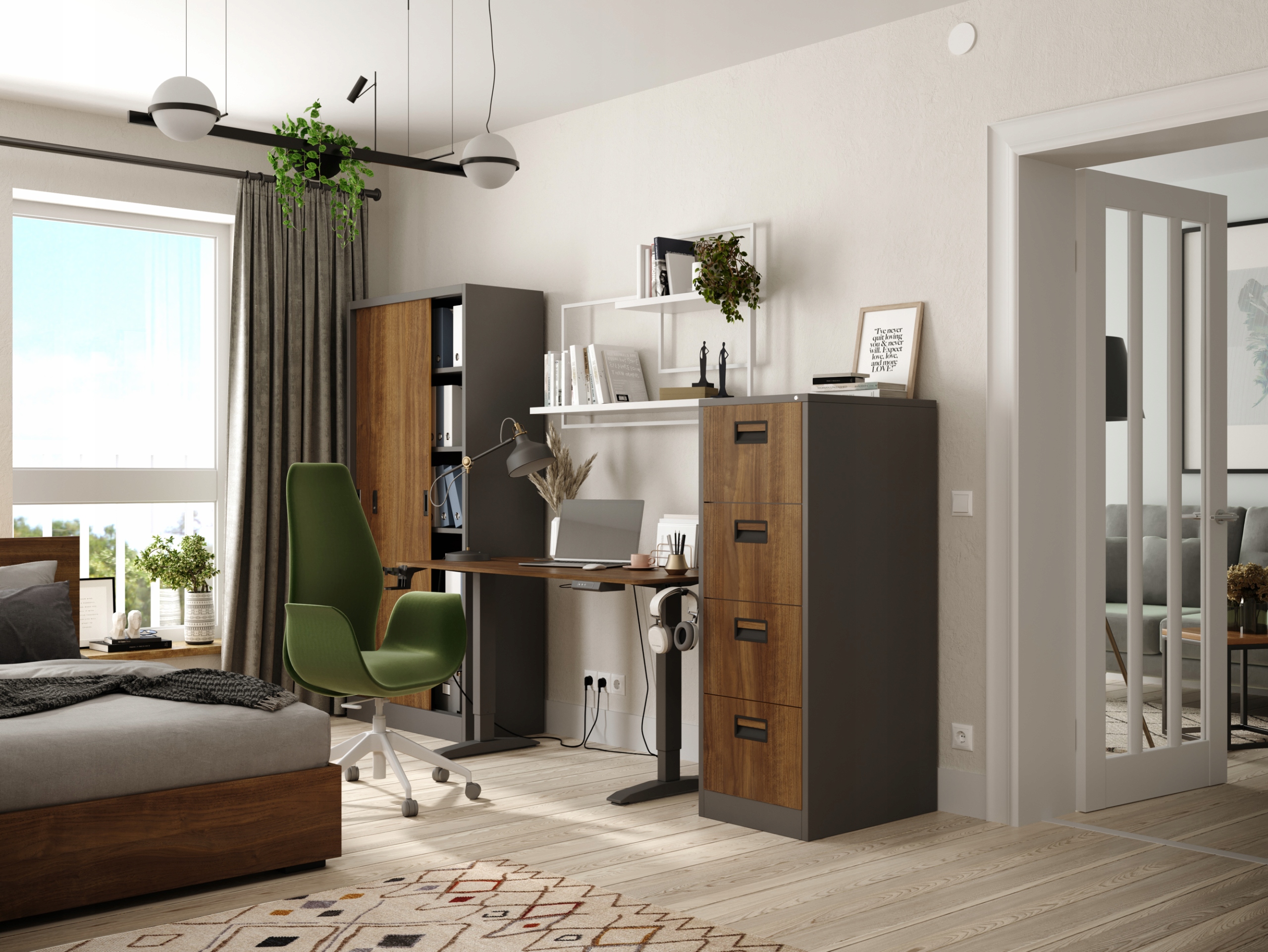Идеально имитирует древесину ореха, экологическая краска обладает высокой стойкостью. к истиранию. Серия Eco design вдохновлена природой, а забота об окружающей среде является одним из наших приоритетов, поэтому шкафы JAN NOWAK изготавливаются исключительно из металла. Эта серия позволит вам создать классическое, элегантное пространство, обеспечив при этом долговечность стальной мебели.