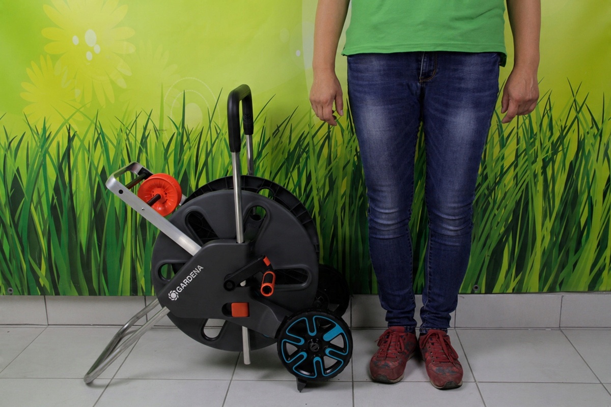 Тележка известной компании Gardena предназначена для хранения и транспортировки садового шланга.