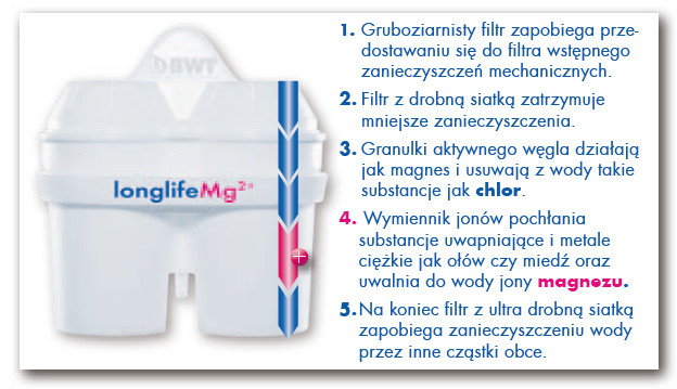 • Магний является носителем вкуса и позволяет полностью раскрыть аромат чая или кофе. Водопроводная вода, отфильтрованная системой BWT, имеет особенно нежный, освежающий вкус. Приготовление пищи в воде, обогащенной магнием, особенно хорошо влияет на вкус, поскольку ионы магния, содержащиеся в фильтрованной воде, препятствуют растворению минералов, содержащихся в пище.