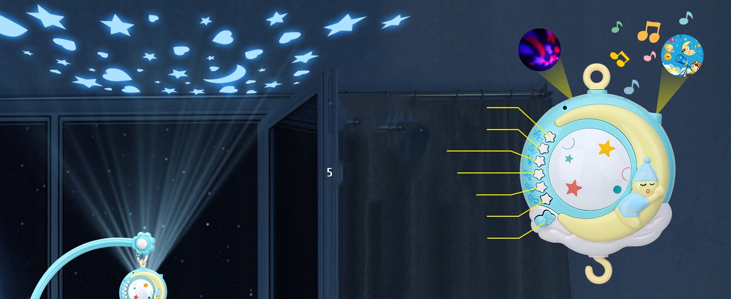 Когда ребенок подрастет, вы можете снять мобиль и спроецировать шоу на потолок, воспроизводя приятную музыку или звуки.