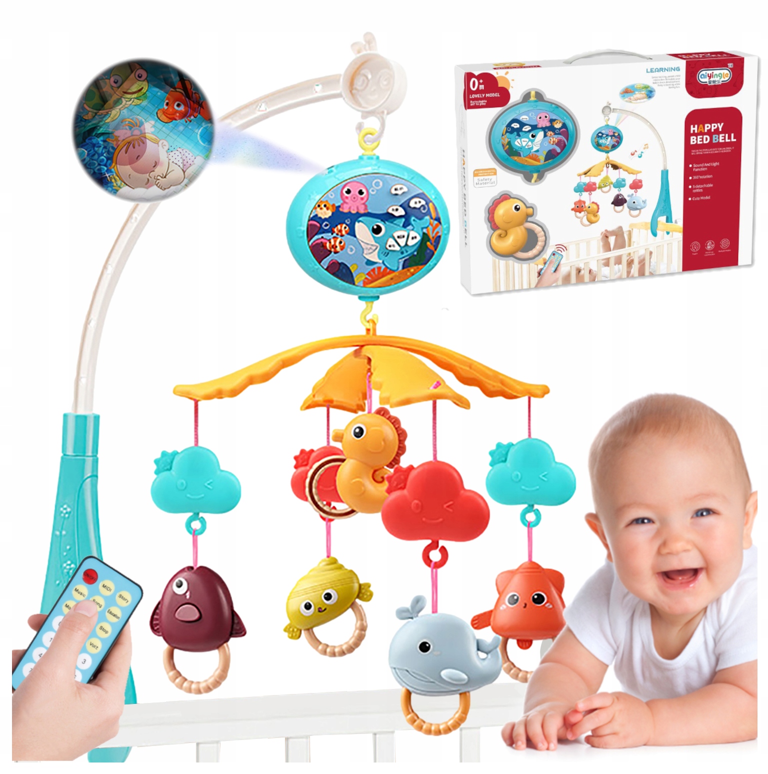 КАРУСЕЛЬ ДЛЯ кроватки с дистанционным управлением - ПРОЕКТОР - МУЗЫКАЛЬНАЯ ШКАТУЛКА - МОРСКИЕ ЖИВОТНЫЕ