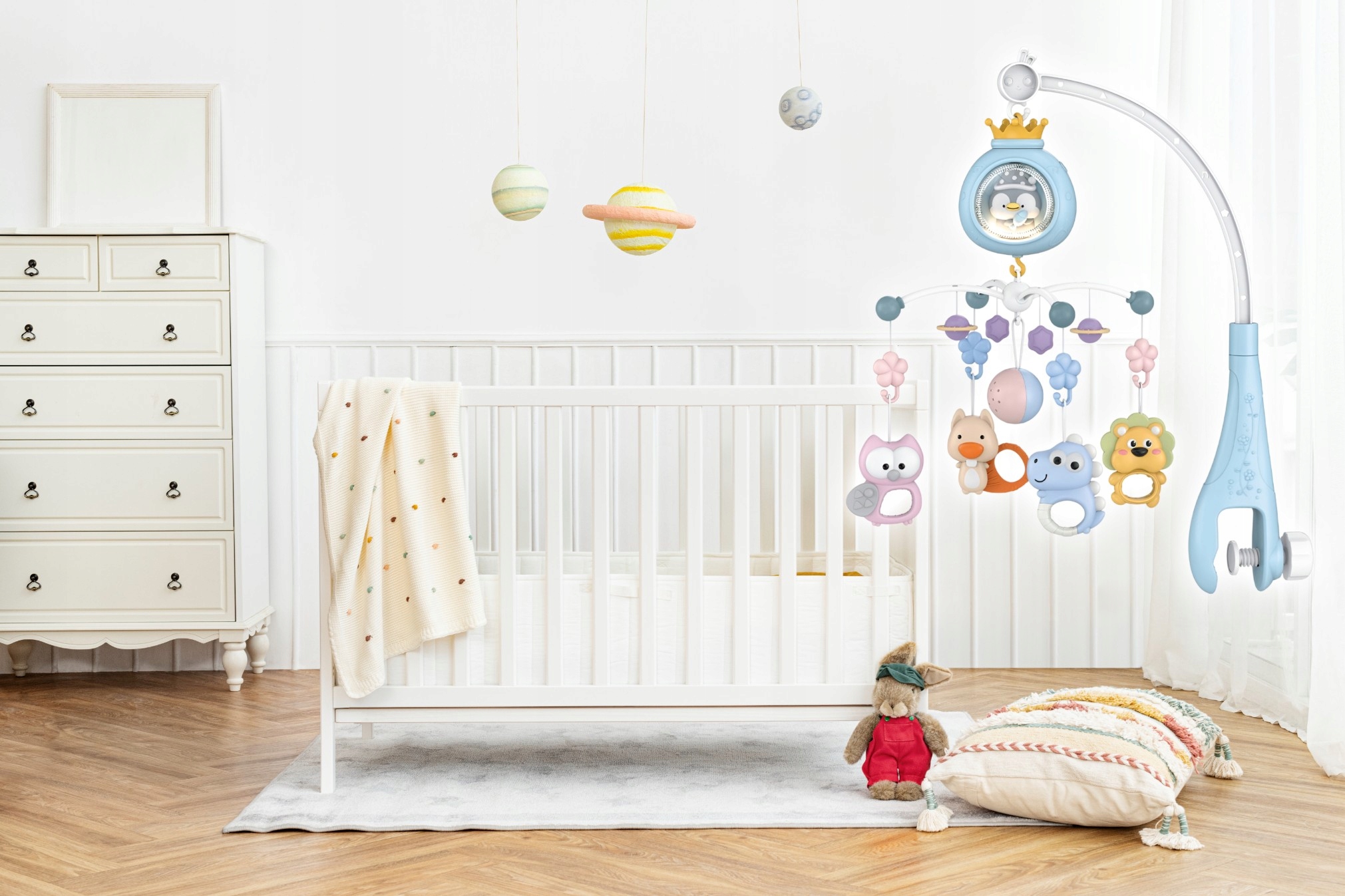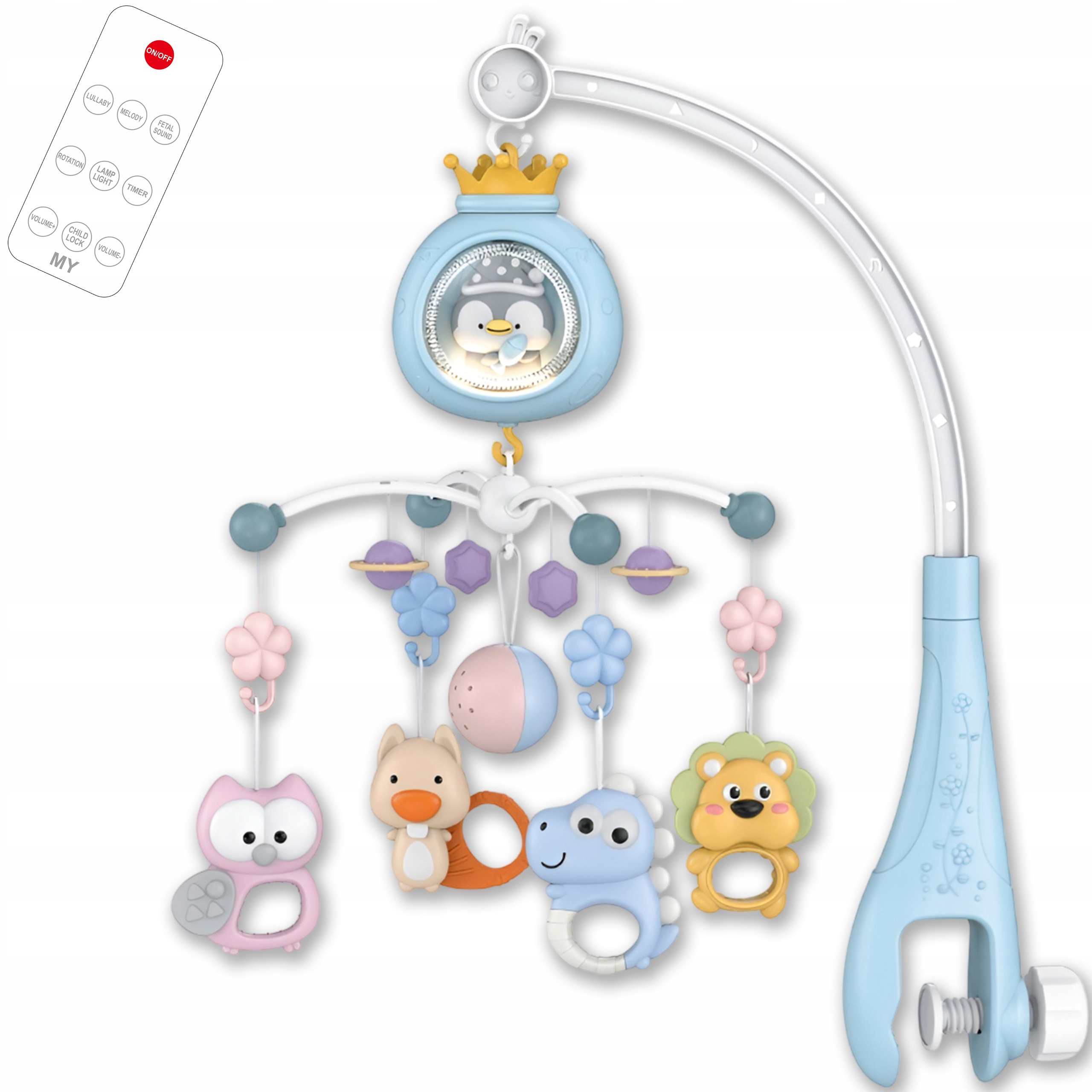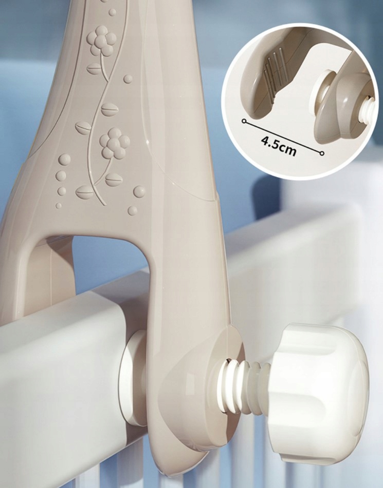 - Прочная ручка позволяет надежно и безопасно прикрепить мобиль к любому типу кровати.