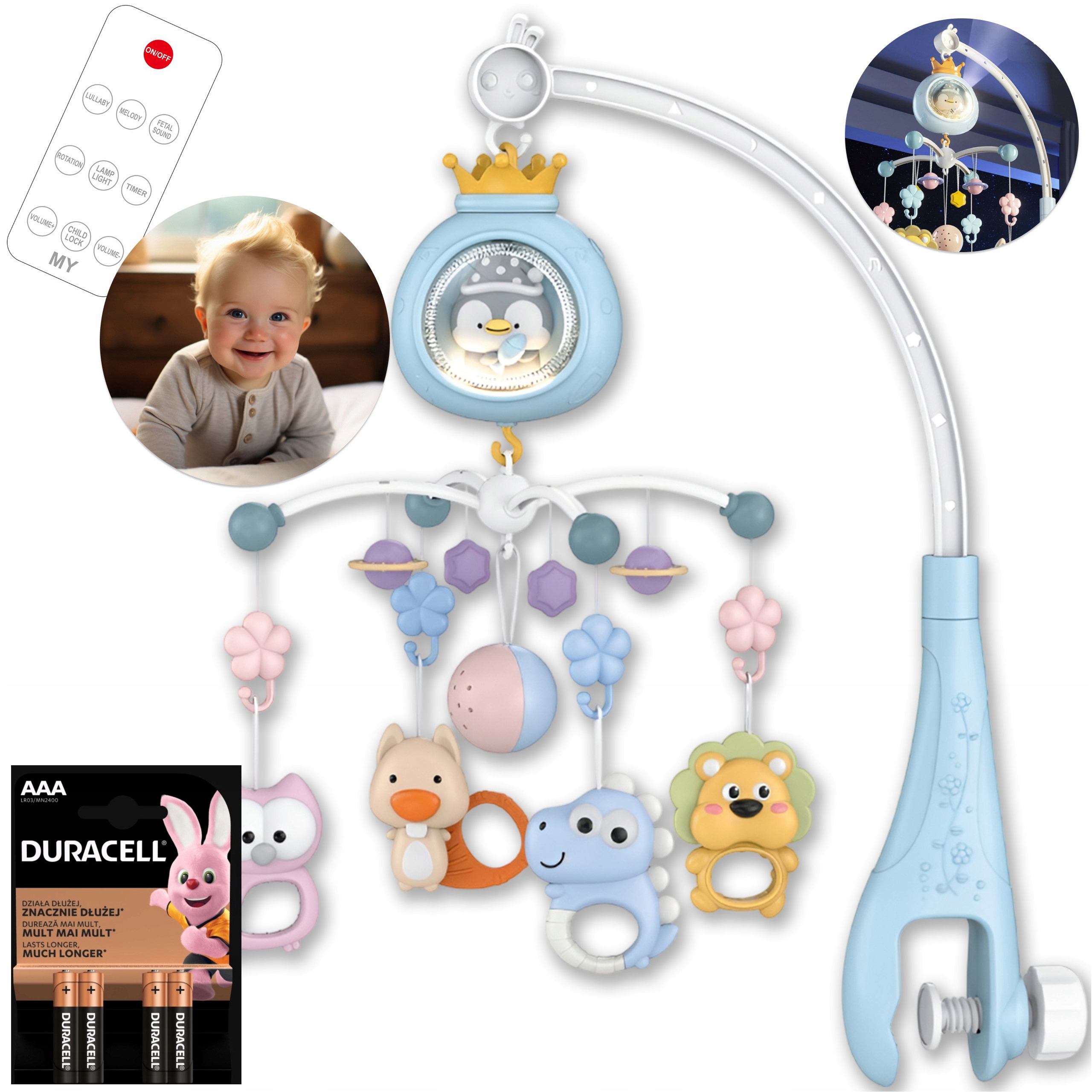 кроватка-карусель с проектором 3 в 1, музыкальная подсветка, пульт дистанционного управления + 4x DURACELL