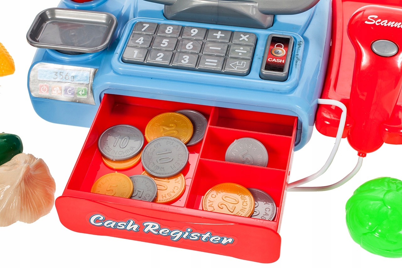 Кассовый аппарат магазина с аксессуарами и сенсорной панелью, служащей калькулятором. Есть ящик, который открывается кнопкой. Ящик вместительный и вмещает все монеты, входящие в набор. В набор входит 8 овощных продуктов.