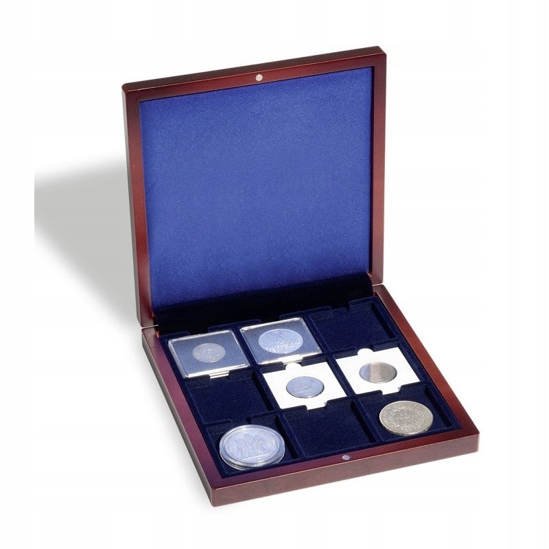 Презентационная кассета Leuchtturm имеет 9 квадратных отверстий, подходящих для 9 капсул Quadrum или 9 рамок для монет из красного дерева. Внутренняя часть покрыта элегантным темно-синим бархатом.