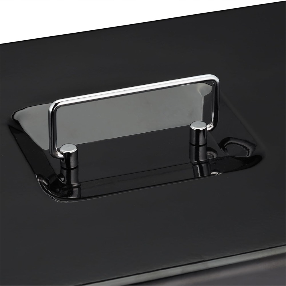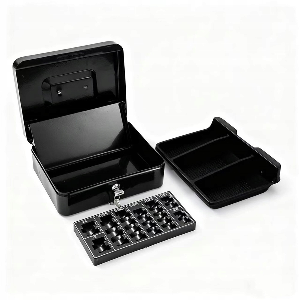 Черный кассовый ящик из прочного железа, стали и пластика. Размеры (высота х ширина х глубина): прибл. 9 х 25 х 18 см.