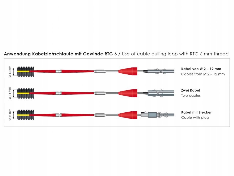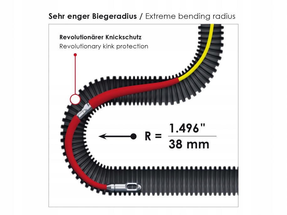 В комплект поставки входит комплект принадлежностей из 18 предметов. Новая технология защиты от перекручивания позволяет преодолевать радиусы изгиба до R = 38 мм. Указанная общая разрывная нагрузка 130 кг относится к стержню из стекловолокна с защитой от перекручивания. Изгибные рукава Идеально сочетаются с инспекционными камерами RUNPOTEC. Входящая в комплект петля для протягивания кабеля (выход R14 мм) со встроенным шарниром и защитным колпачком может использоваться для одного или нескольких кабелей диаметром до 12 мм. Быстро прикрепите кабели к петле. Любые вилки защищены растяжимой лентой. нагрузка на кабель. Оптимальная зона применения: для труб диаметром 10 мм – 50 мм.