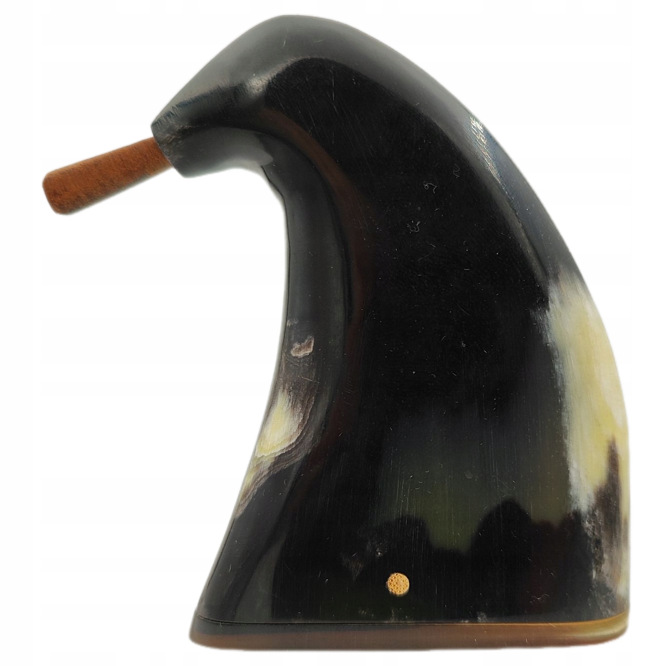 Дно табакерки также было изготовлено из рогов. Чтобы открыть его, вытолкните деревянную заглушку, расположенную сбоку. В верхней части табакерки имеется кожаный колпачок.