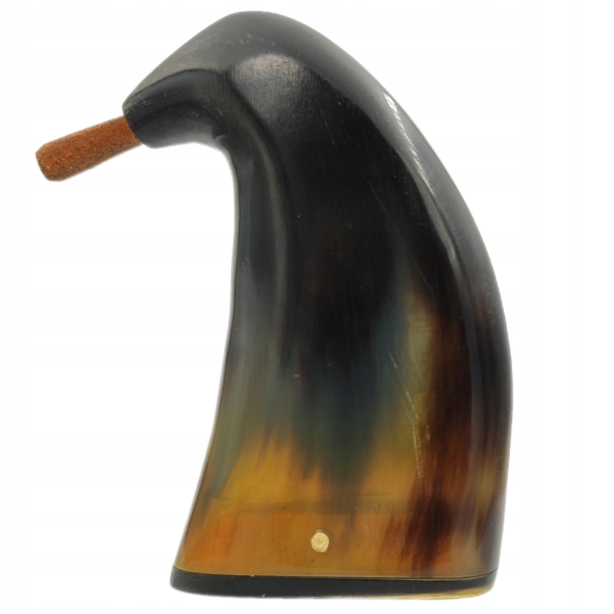 Дно табакерки также было изготовлено из рогов. Чтобы открыть его, вытолкните деревянную заглушку, расположенную сбоку. В верхней части табакерки имеется кожаный колпачок.