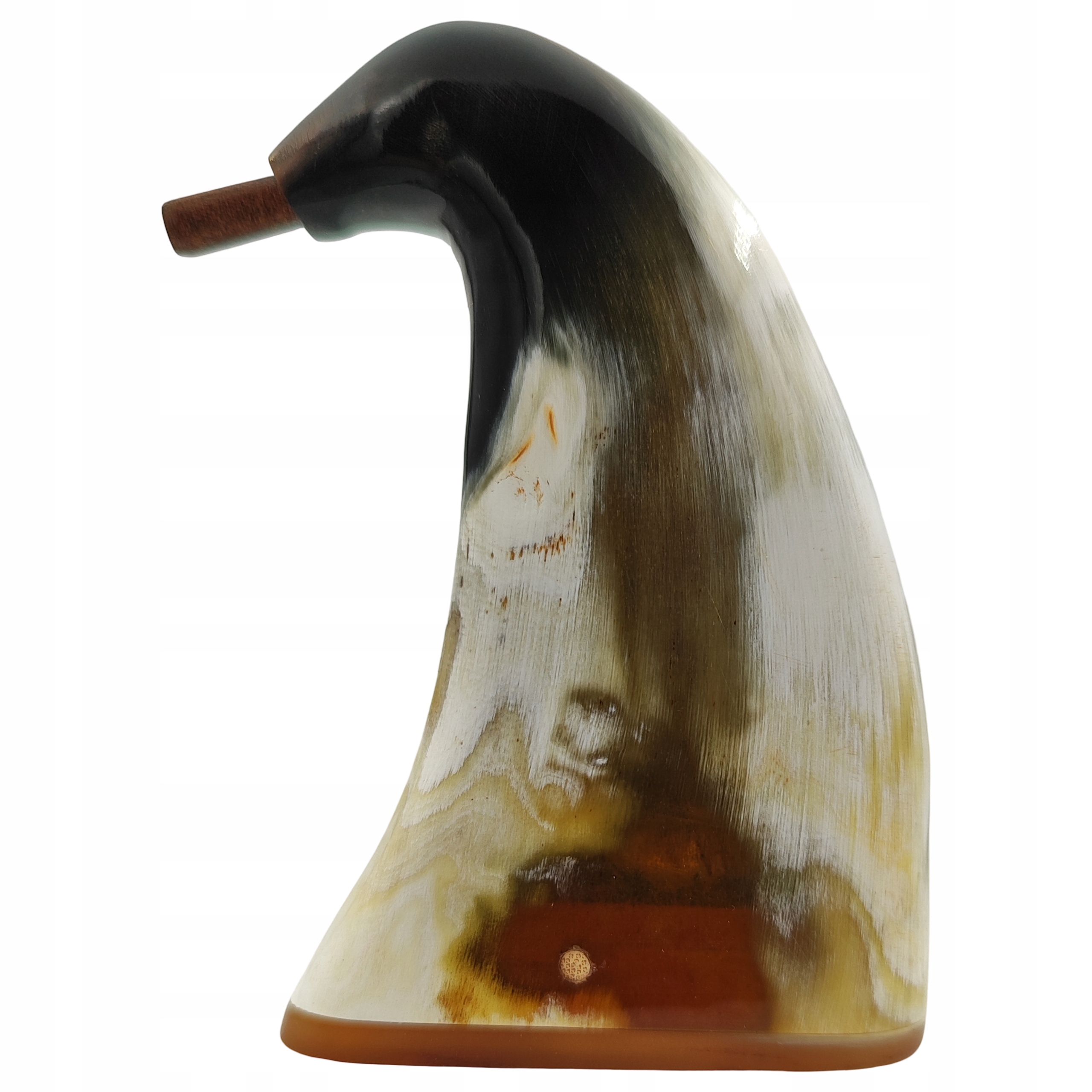 Дно табакерки также было изготовлено из рогов. Чтобы открыть его, вытолкните деревянную заглушку, расположенную сбоку. Наверху табакерки имеется кожаный колпак.