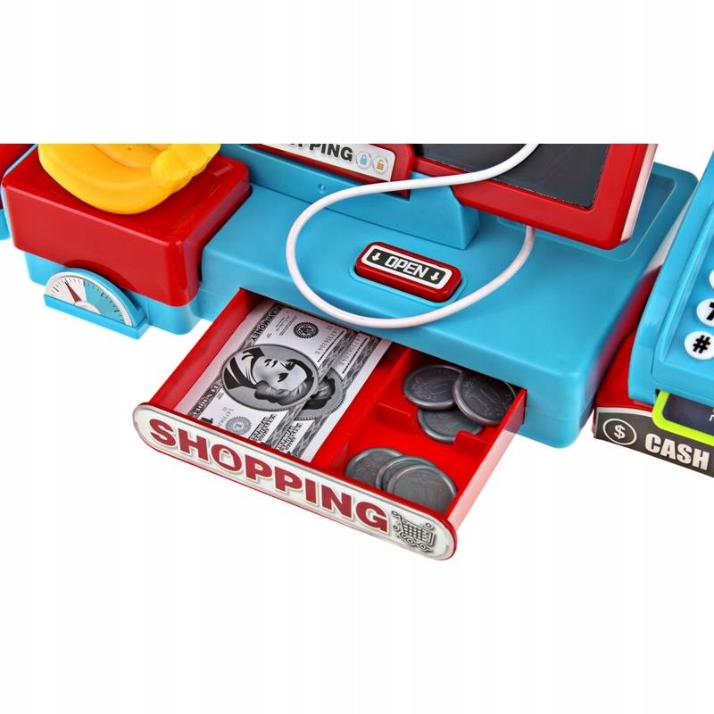 - ЯЩИК ДЛЯ ДЕНЕГ: Кассовый аппарат имеет ящик, открывающийся кнопкой, в который можно положить входящие в комплект монеты и банкноты.